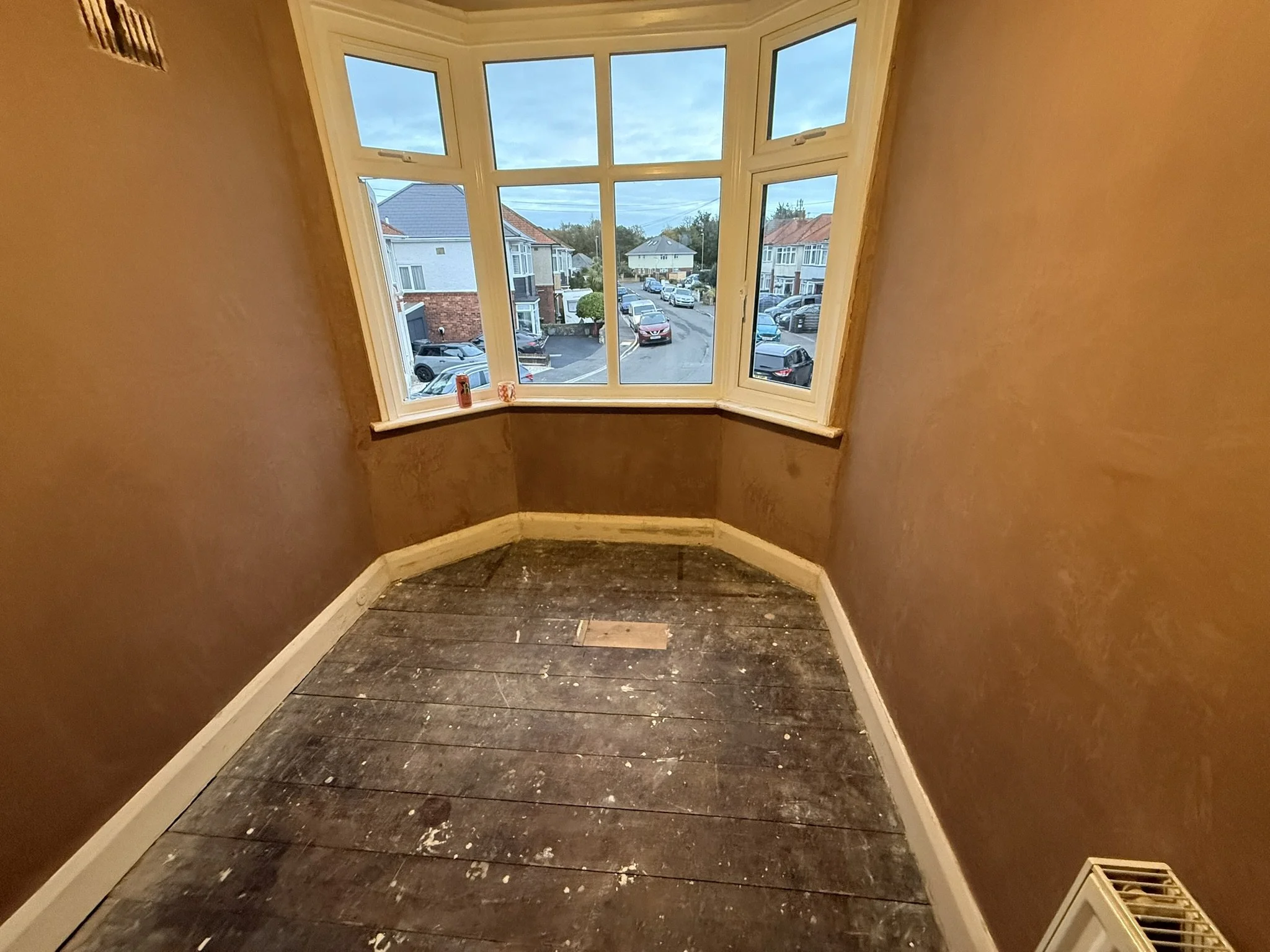 And here is the finished room, with nice smooth plastered walls and ceiling, much warmer with its now insulated bay window, the brand new windows kept clean as thanks to the plastic they were covered in and the woodwork wiped clean ready for painting in a few days time.